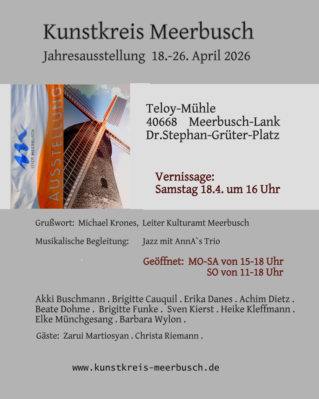 Der Kunstkreis Meerbusch ruft das Volk zu seiner Jahresausstellung 2026 in die wundervollen Teloy-Mühle nach Meerbusch.
